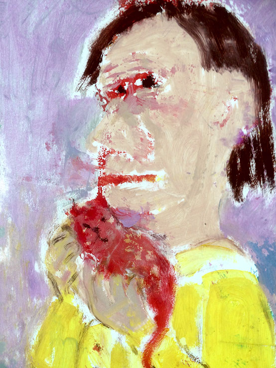 Man with a red cat (2017), olieverf op geprepareerd karton, 30/24 cm. TE KOOP € 50