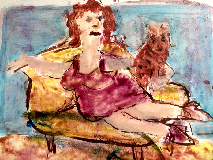 Vrouw op sofa (2017), olieverf op geprepareerd karton, 24/18 cm. TE KOOP € 40